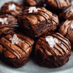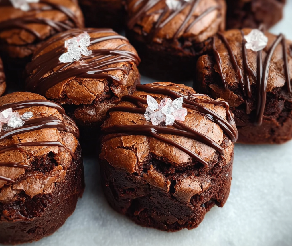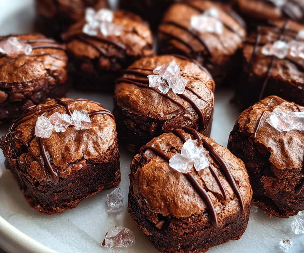 Brownie Petit Fours are miniature brownie desserts topped with rich chocolate ganache and often garnished with Fleur de sel. They are perfect for any occasion.